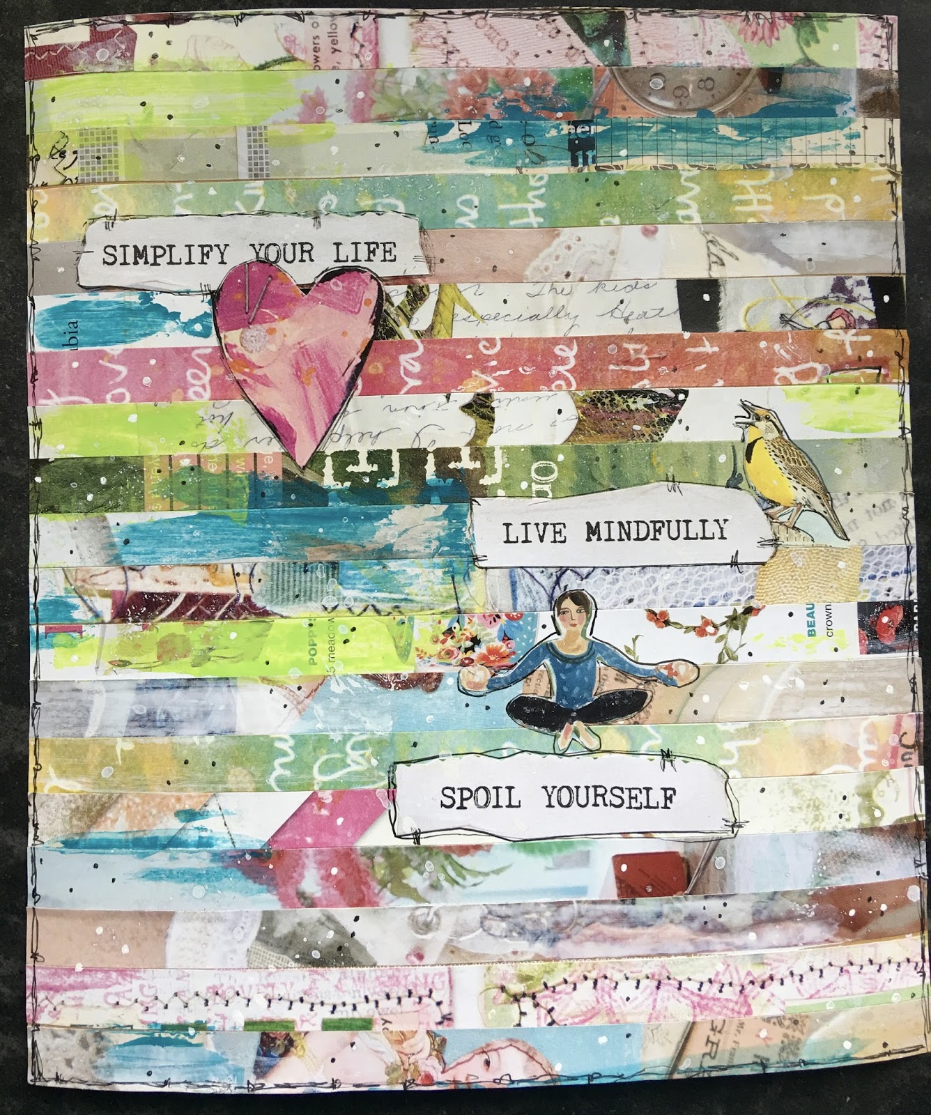 Because the pages are so thin, some pens and stamped images will bleed through, so when I wanted a stamped image, I stamped on a scrap of paper and glued that on the page.