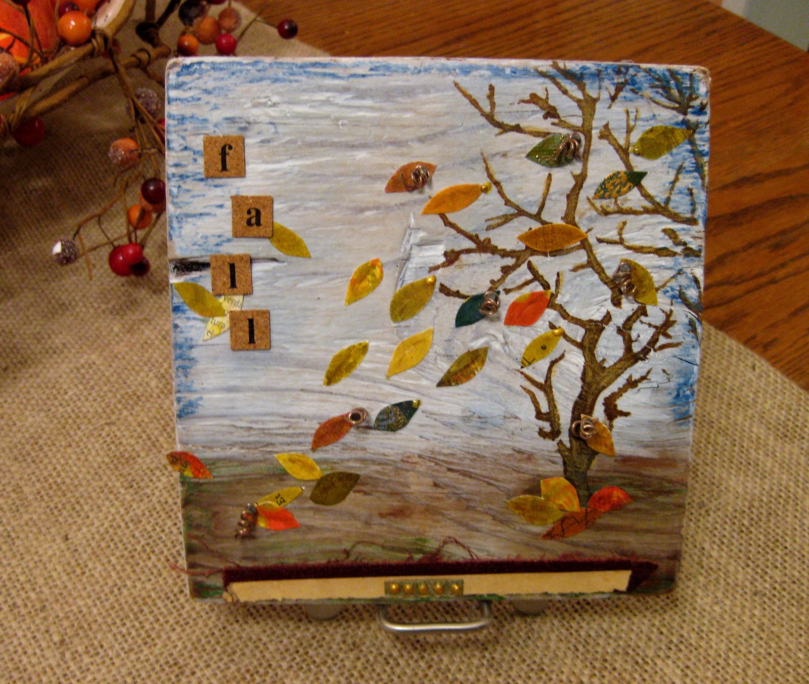 I washed on some diluted acrylic paint and added some extra color with oil pastels around the edges. The stenciled tree was done with acrylic paint. I cut out leaves from various fall-colored papers. The fun part was banging in small nails on the leaves and adding some curled wire . A small piece of torn book binding along the bottom adds some grounding.